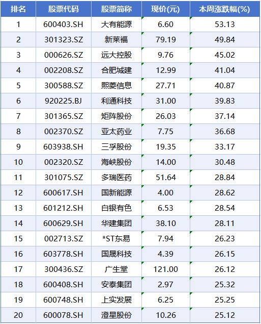 个股方面,本周个股涨幅榜前五位分别是大有能源、新莱福、远大控股、合肥城建、熙菱信息,累计涨幅分别为53.13%、49.84%、45.02%、41.04%、40.87%。