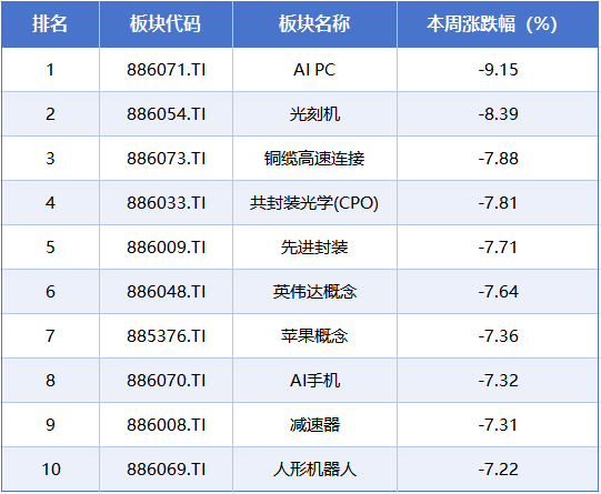 本周排在跌幅榜前排的概念板块分别是AI PC、光刻机、铜缆高速连接、共封装光学、先进封装,累计跌幅分别为9.15%、8.39%、7.88%、7.81%、7.71%。