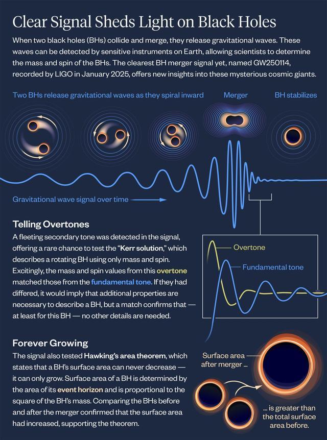 此次最清晰的信号来自2025年1月14日的黑洞合并事件GW250114。其与首次GW150914事件类似,两个黑洞质量都为太阳的30至40倍,距离地球约13亿光年。但经过十年技术进步,GW250114信号在仪器噪音极大降低后呈现得格外清楚。
