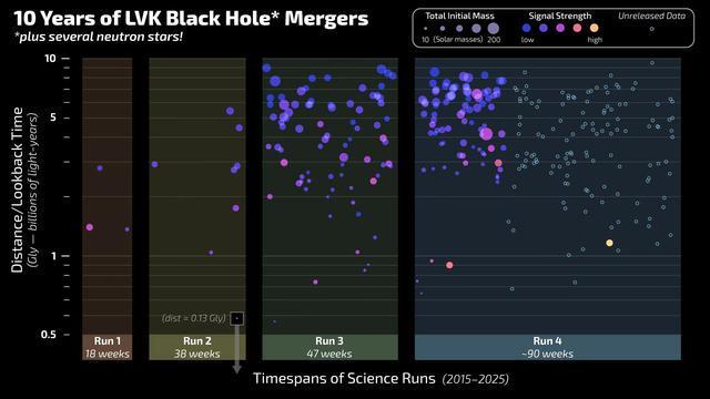 LVK网络十年来还发现了众多宇宙合并事件,包括中子星碰撞(如2017年著名的黄金喷发事件),首次黑洞-中子星碰撞,不对称质量合并,以及迄今发现的最大质量的黑洞碰撞等,不断刷新人类对宇宙认知的边界。