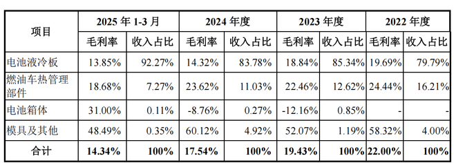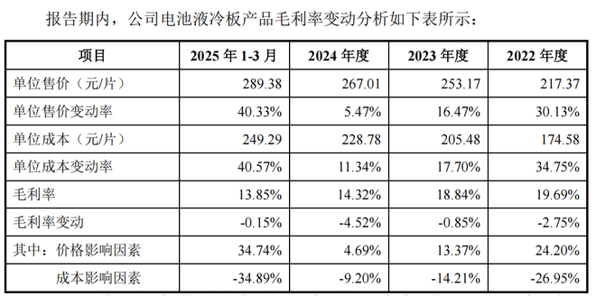2023年度、2024年度、2025年1-3月,纳百川电池液冷板产品毛利率分别为19.69%、18.84%、14.32%、13.85%。虽然电池液冷板的平均售价持续上升,但是随着尺寸规格较大产品的销售占比增加,以及销售结构变动叠加新建产能的磨合、折旧摊销,导致电池液冷板的单位成本上升更快。