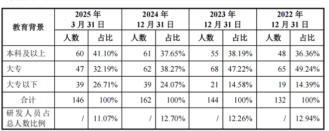 截至2025年3月31日,公司从事技术和研发相关的人员为146人,占公司员工总人数的11.07%。从教育背景看,大专及以下占比近六成。