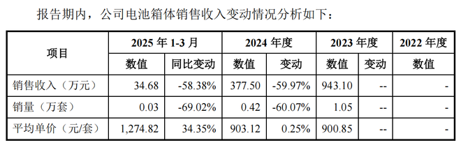 纳百川电池箱体产品于2023年下半年开始投产,2023年度、2024年度、2025年1-3月分别实现销售收入943.10万元、377.50万元、34.68万元,产品目前主要应用于储能电池热管理领域,产能以试验性为主,尚未开始放量进行规模化生产。