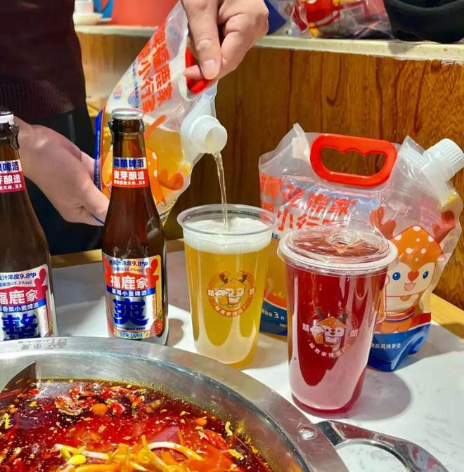 福鹿家显然想明白了这件事,小甜水才是核心,其他的无论是鲜啤、咖啡还是茶叶,都是包装。当然,小甜水进入到鲜啤领域也得进行“本地化”改造,份量像一般啤酒一样按1斤、3斤、5斤售卖,容器除了奶茶杯,还给大份量鲜啤打造了啤酒袋,就连小零食摆出的都是瓜子花生等传统下酒菜。