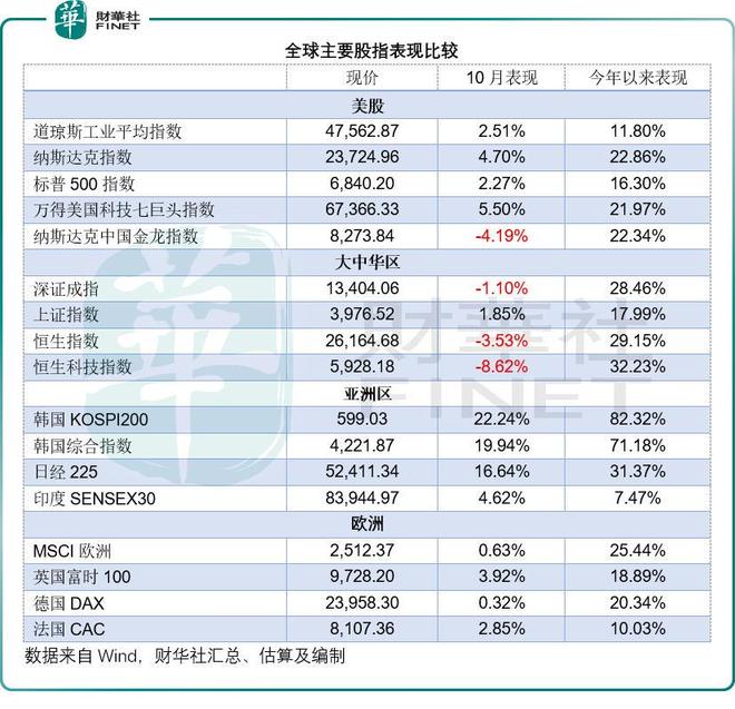 白银今年以来64.73%、现货金52.53%的年度累计涨幅仍在刷新纪录、港股、A股(深证成指)年内约三成的反弹也堪称亮眼,但单月维度的表现却暴露了行情的脆弱性——单就10月来看,恒生指数跌3.53%,恒生科技指数跌8.62%,深证成指跌1.10%,上证指数虽然一度突破4,000点,却难守住火线,10月的涨幅也仅1.85%,明显跑输纳斯达克指数4.70%、标普500指数2.27%的单月涨幅。