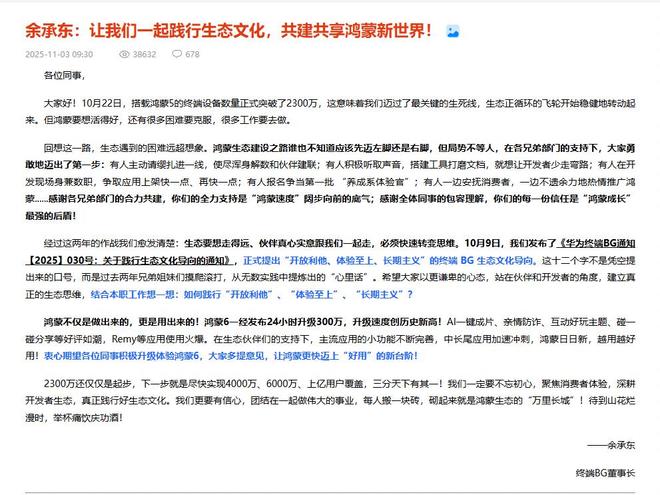 他在信中透露了原生鸿蒙的关键进展:10月22日,搭载鸿蒙5(即原生鸿蒙,HarmonyOS NEXT)的终端设备数量正式突破了2300万。