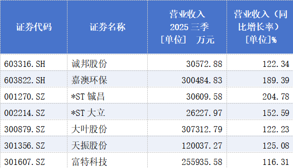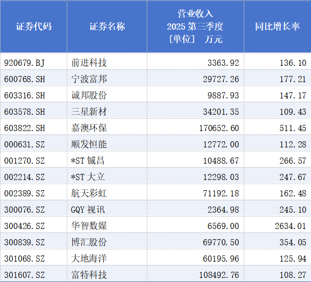 从前三季度业绩情况来看,在营业收入实现同比增长的共有446家企业中,同比涨幅超过100%的企业有7家,分别为诚邦股份、嘉澳环保、*ST铖昌、*ST大立、大叶股份、天振股份、富特科技,分别上涨122.34%、189.39%、204.78%、152.59%、122.23%、125.08%、116.31%。