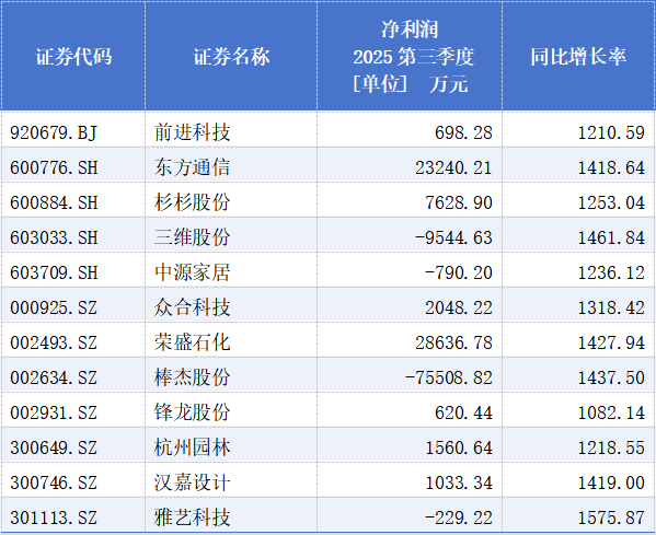 从净利润情况来看,有79家企业净利润同比增长超100%;有12家企业净利润同比增长超1000%,分别为前进科技、东方通信、杉杉股份、三维股份、中源家居、众合科技、荣盛石化、棒杰股份、锋龙股份、杭州园林、汉嘉设计、雅艺科技。