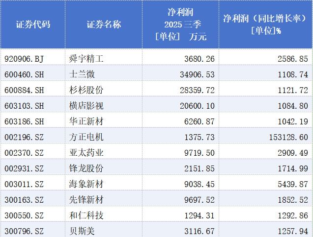 相比营收,浙江上市公司前三季度净利润的涨幅则更为抢眼。在净利润实现同比增长的394家企业中,同比涨幅超过100%的企业有83家;另有同比涨幅超1000%,也就是超过10倍的企业有11家,分别为舜宇精工、士兰微、杉杉股份、横店影视、华正新材、亚太药业、锋龙股份、海象新材、先锋新材、和仁科技、贝斯美。