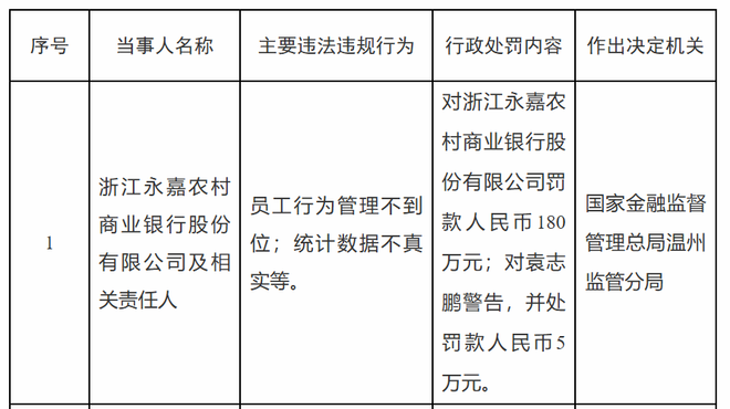 浙江永嘉农商行因统计数据不真实被罚款180万
