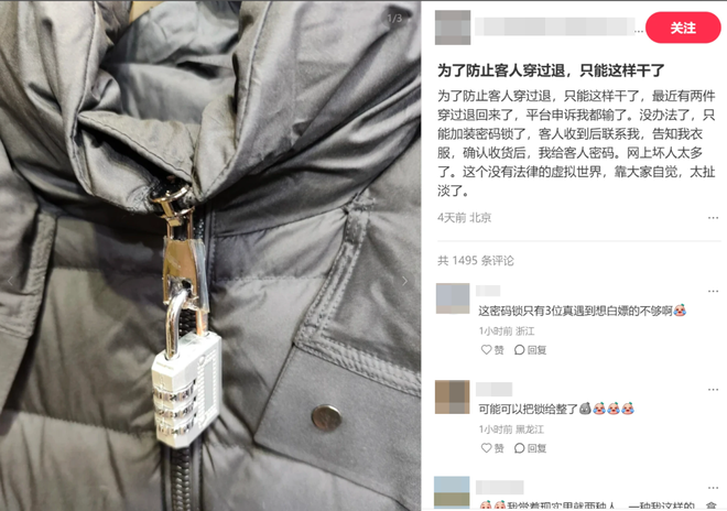 可当默契被推向极端,就演变成了一场各方皆输的“试衣游戏”。在这场由少数人引发的“退货狂欢”中,受伤的不仅是苦苦支撑的商家,还有那些规规矩矩试穿、却因繁琐流程或误判而体验不佳的消费者,“现在做成这么大的吊牌试穿都不方便,难道商家和平台默认每个人都是来‘白嫖’的吗?”