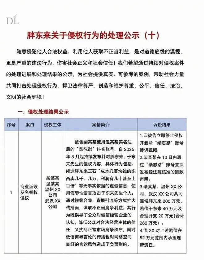 公示称,被告柴某某使用温某某实名注册的“柴怼怼”抖音账号,自2025年3月起持续发布针对胖东来、于东来先生的侵权内容,具体行为包括:编造胖东来玉石“成本几百块钱的东西卖几千、几万,利润有几十甚至上百倍”等无事实依据的虚假信息;使用侮辱性语言攻击于东来先生个人;通过视频合集、直播引流等方式扩大传播面,谋取不正当竞争利益。其行为既误导了公众对诚信经营企业的认知,降低公众对合法经营主体的信任,又扰乱正常市场竞争秩序,同时低俗悔辱言论的传播也对网络空间良好的言论风气造成了负面影响。
