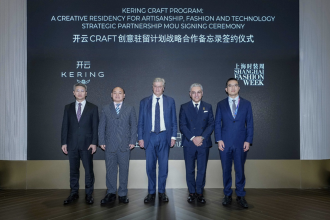 开云集团以“创意传世”为核心呈现全品牌展陈,并与上海时装周签署战略合作备忘录,启动“开云CRAFT创意驻留计划”,面向工艺、时装与科技的跨界培养与共创。展馆集中展示旗下品牌最新动向:古驰带来1950—1990年代典藏丝巾与艺术家现场涂绘;巴黎世家香氛系列亚太首发;葆蝶家香水首次登陆进博;麦昆在Met Gala亮相的定制礼服全球首次展出。观众可通过AR互动完成“签字时刻”和“寻宝地图”等沉浸体验。