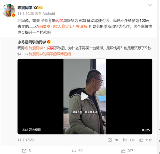 此前,陈震曾公开表示:“我知道闪灵的辅助驾驶技术不如中国品牌,但我没想到作为全球最贵的电动车,劳斯莱斯闪灵的科技配置竟然这么薄弱,连最基本的主动安全都处理不好。”他甚至直言,如果劳斯莱斯闪灵能够配备华为ADS辅助驾驶技术,他会毫不犹豫地为此多花100万元购买。
