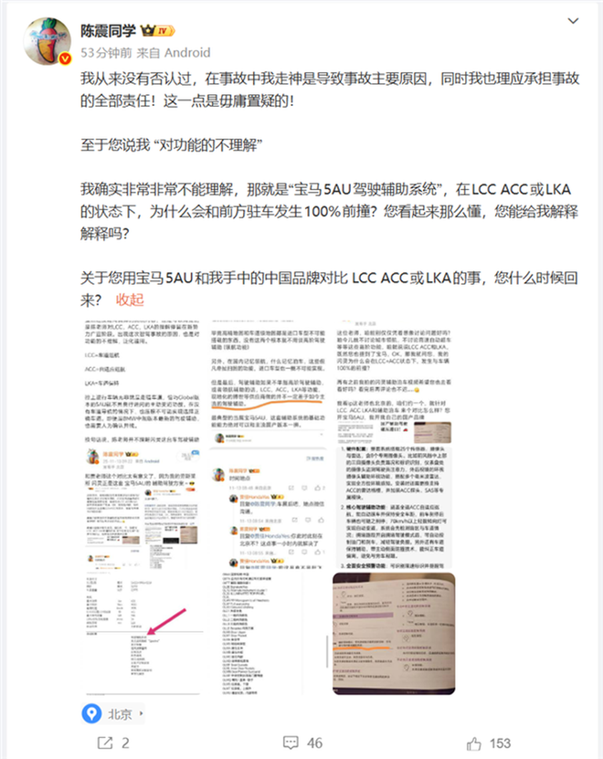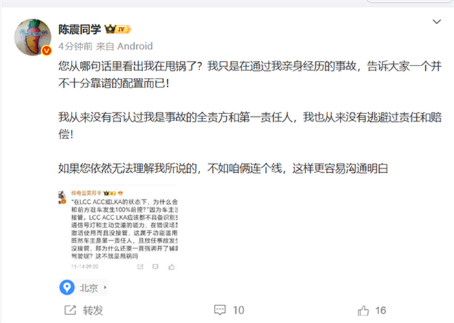 陈震进一步指出,虽然自己没有“甩锅”,但他通过亲身经历向大家提醒,某些辅助驾驶配置可能并不可靠。他提到,尽管闪灵配备了高端的辅助驾驶技术,但在实际操作中,这些技术却未能如预期般有效,尤其是最基础的主动安全功能似乎存在缺陷。