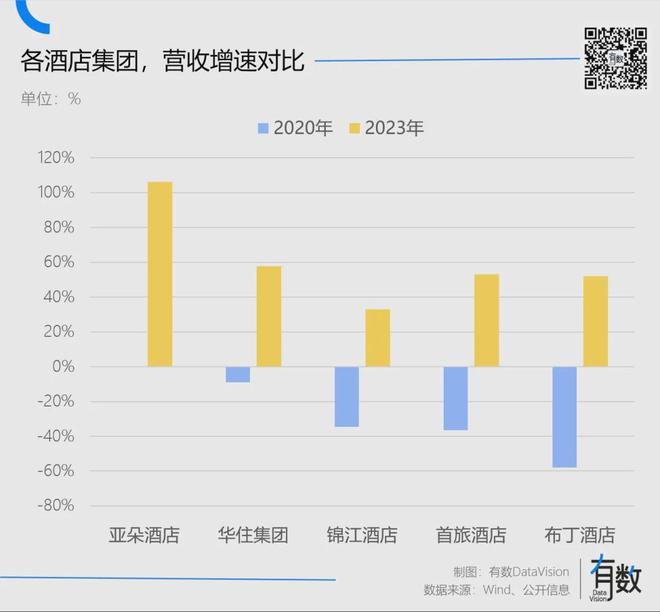 与布丁的惨状相比,定位中高端的亚朵复苏势头最猛。2023年,亚朵营收一跃来到46.7亿元,同比增长106%,净利润翻了6.7倍,领先一众同行。