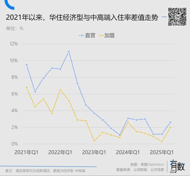 2023年,华住体系内经济型入住率一度比中高端多出11.1%,但目前两者差距微乎其微,一度不到1%。无独有偶,锦江收购中端酒店品牌维也纳后,在2018年就实现了中高端入住率对经济型的反超。