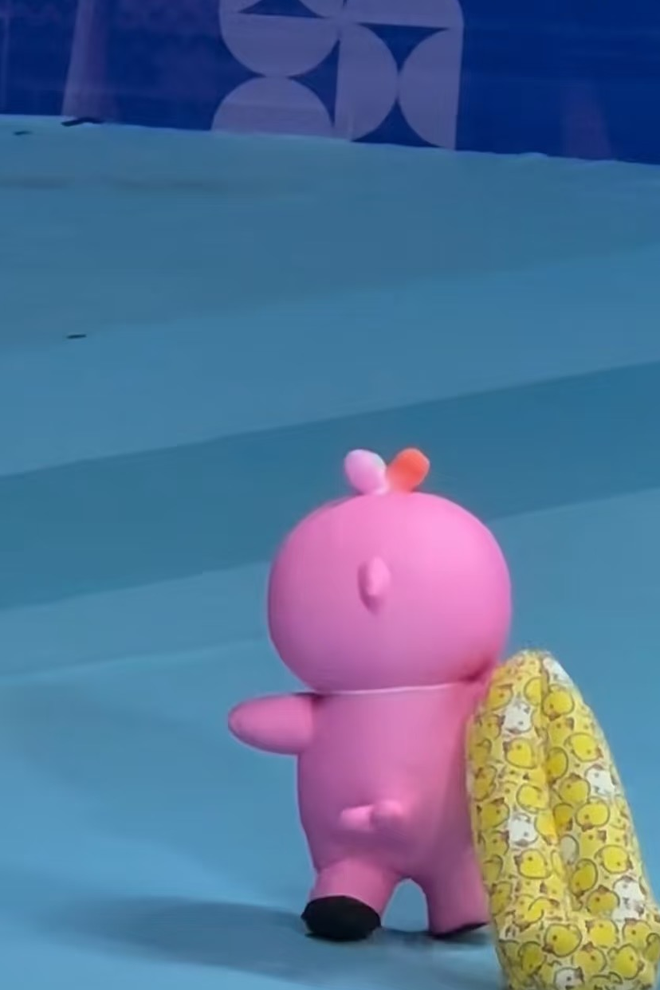 大湾鸡彻底颠覆了所有人对吉祥物“安静、笨拙、呆萌”的刻板印象:冰墩墩当年出圈的视频是在场上摔倒了自己站不起来,需要工作人员搀扶起身。而大湾鸡倒下后,能用强大的核心力量将身子旋转180度,然后再用头走一段路。