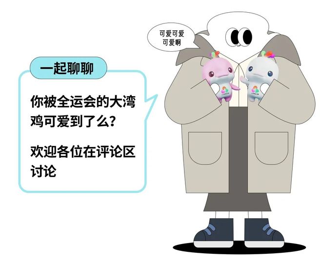 “大湾鸡”在设计之初,原型的确是两只中华白海豚,就像它们的原名也不是“大湾鸡”,而是“喜洋洋”和“乐融融”。设计团队负责人刘平云解释,中华白海豚是“海上国宝”,和大湾区有深厚联系,所以作为这次全运会的吉祥物。一白一粉,粉色是白海豚运动后皮肤充血的颜色,契合了“运动”主题。