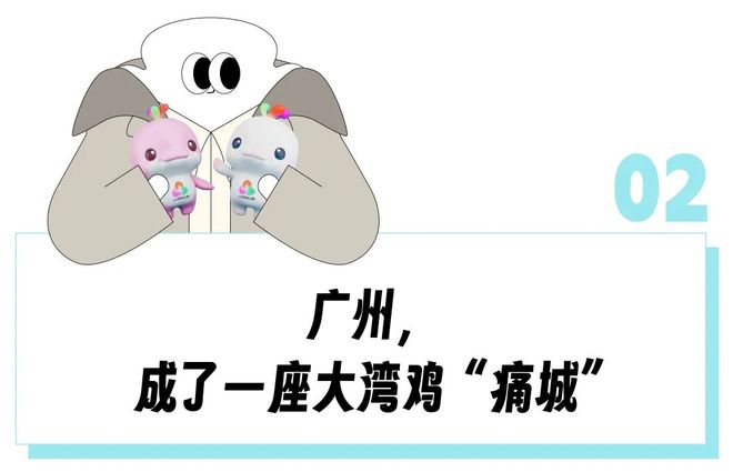 光是大湾鸡的著名打卡点就超过11个。广州塔广场上竖着经典的“骑马过海大湾鸡”雕像,“六运小区”周围散落了十来个大湾鸡,从跑步鸡、冲浪鸡到鸡剑、拳鸡。“抓鸡”抓得轰轰烈烈,最后每一只鸡都被配上诸如“我讲咗n次啦我系海豚唔系鸡”的粤语,变成了“广东人必备表情包”。