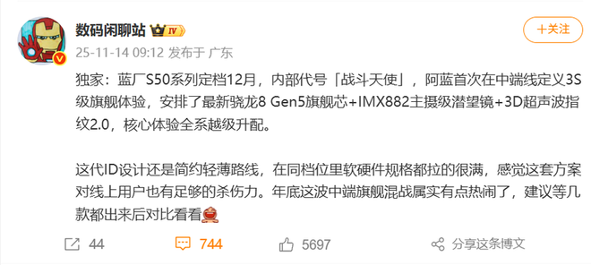 据悉,vivo S50系列将会搭载第五代骁龙8移动平台,该平台预计将会在11月下旬推出。影像上则配备了索尼IMX882潜望长焦,同时也标配3D超声波传感器。得益于旗舰级的配置,vivo S50系列也被称为“Super S”。