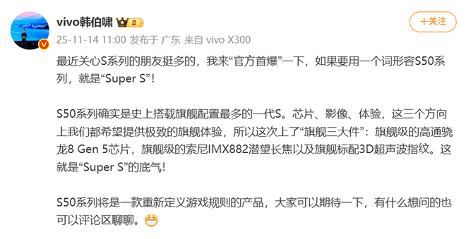 今日,vivo产品经理韩伯啸在微博上首次公布了vivo S50系列的信息,据韩伯啸透露,vivo S50系列将会搭载旗舰级配置,在芯片、影像以及体验上都具备旗舰级体验。