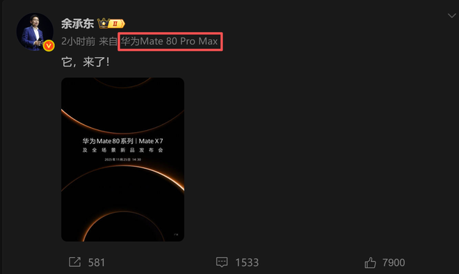 华为Mate 80系列终于揭开神秘面纱,今日正式官宣!这次官方Slogan为“实力破圈,开启新篇”,并将于11月25日发布。届时不仅会推出Mate 80系列,还将展示Mate X7以及全场景新品。同时,华为消费者业务CEO余承东今天上午也通过微博发布了一段预热视频(微博小尾巴为华为Mate 80 Pro Max),这也是华为Mate 80 Pro Max真机外观的首次亮相。