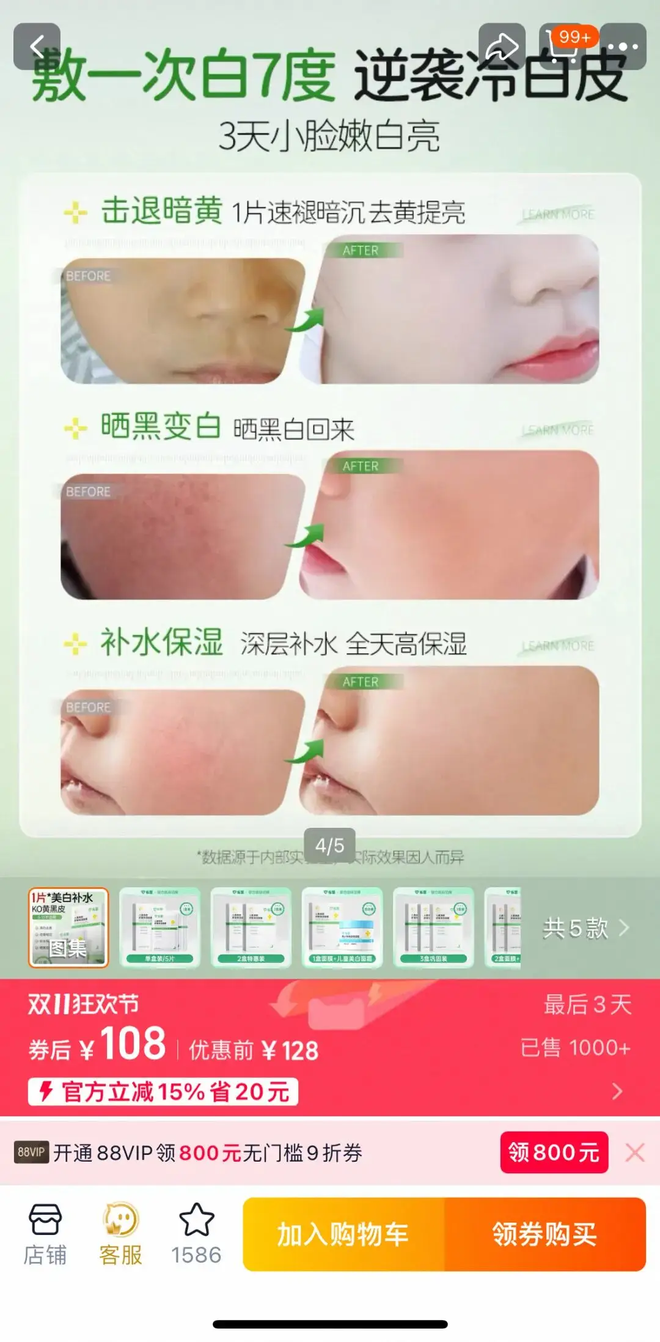 某品牌儿童面膜的商品主图上,“1片孩子脸变白,速成冷白皮” 的宣传语格外醒目,并且该商品链接显示销量已突破1000+。