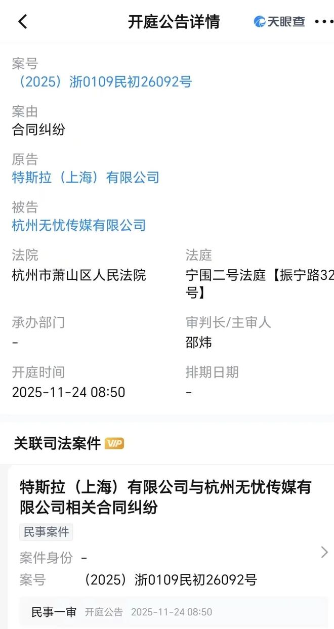 11月18日消息,据天眼查APP显示,特斯拉(上海)有限公司起诉杭州无忧传媒有限公司(下称无忧传媒)一案,将于11月24日在杭州市萧山区人民法院开庭审理。案由是合同纠纷。