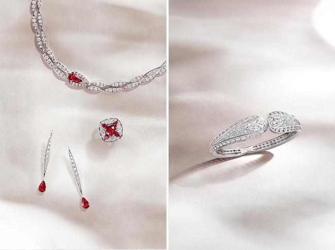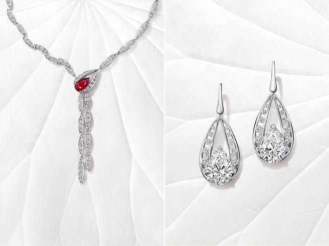 这一高级珠宝系列以"华夏美学,当代创绎"为核心定位,灵感源自于华夏哲学的深邃睿思与东方建筑的瑰丽意象,涵盖莲花、天地、喜乐、宫殿、门钉、古瓦、长城等灵感元素,并采用中西合璧的创作手法,织就出包括"莲华清韵""天圆地方""传喜"等不同主题共百余件高级珠宝臻作。