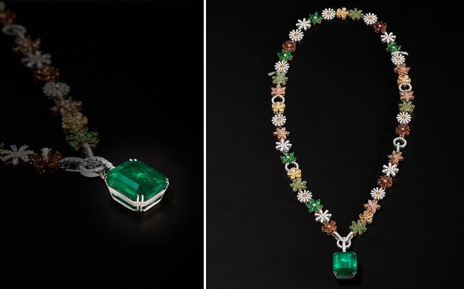 Dolce Stil Novo项链归属"灵境风华"篇章,设计仿若一首献给托斯卡纳丘陵的十四行诗,婉转铺展一条蜿蜒小径,野花于两则草地烂漫盛开。整件作品由白金、黄金与玫瑰金交织而成,形状各异的祖母绿与无色、黄色与棕色钻石以多种切割工艺镶嵌其中。主石为一颗重达31.46克拉、呈"木佐绿"色调的珍稀哥伦比亚祖母绿。花卉元素点缀其间,尤以雏菊最为醒目,意在致敬14世纪意大利诗人笔下那翩然脱俗的女性形象。
