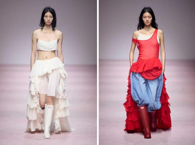在此次合作中,XU ZHI以8套独特的秀场造型,对HUNTER的经典雨靴进行创意重塑。系列灵感源自法国诗人兰波的诗歌灵魂,探寻浪漫主义与颓美的边界。雨靴为整体秀场形象注入粗旷而实用的探索气息,不仅强化了视觉上的层次感,更暗示着一种不受拘束的旅途精神——仿佛漫游于都市与荒野之间的流浪诗人,巧妙地连接着传统与现代、典雅与不羁。