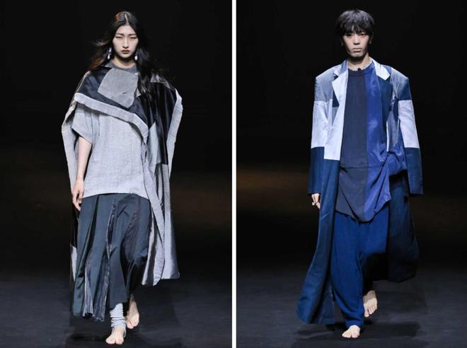 ili node本季作品中对"一衣多穿"概念进行更为极致的演绎,同一组布料在视觉效果上的丰富变换,如同集体创伤下不同人物的相异选择。不对称解构进而赋予其更具张力与生命感的廓形。拼接与重组成为系列中游走的线索,隐喻着个体对自我的修葺与再造。色彩上,蓝色的一抹既是对主题灵感中里斯本彩釉的呼应,亦是伤痕破裂后的底色,深沉冷静却又无限可能。