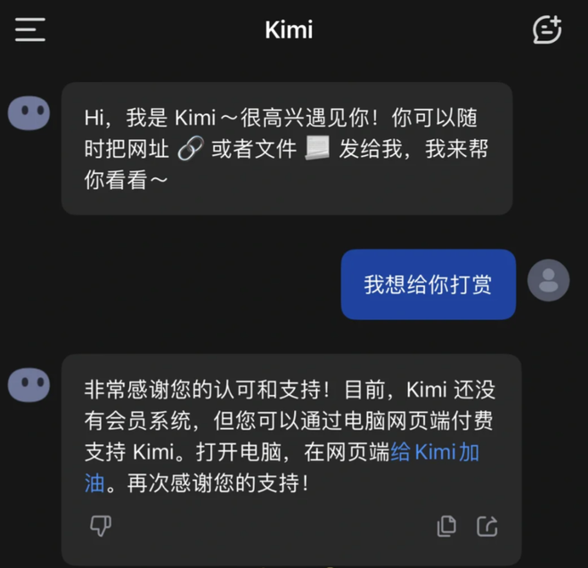 Kimi似乎正试图和你搭建一种超越工具之外的“关系”:“打赏”不同于充会员,在打赏的逻辑之下,AI不是像视频软件那样“被使用”,而是主动的服务提供者,而你“理应为享受服务付费”。
