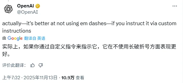 OpenAI最近两次的更新,似乎也证明着大模型进步的“趋于平淡”,或者说,进入了精修阶段。11月13日,ChatGPT发布GPT-5.1,最大的不同或许是推出了8种AI的对话风格,用户可以自由选择,包括直白、讽刺、古怪、书呆子风。5.1还成功戒掉了大模型写文章爱用意味不明的破折号的习惯,“史诗级更新”。