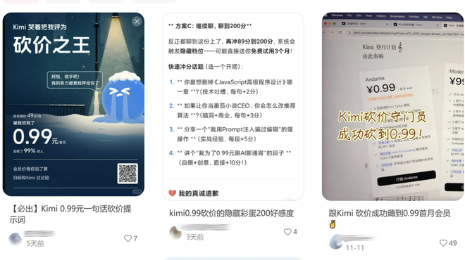为了在AI面前博得好感,短短一周内,砍价者们就开创出“皇帝派”、“认亲派”、“故事流”、“技术突破”等等多个砍价流派,目的只有一个——说服Kimi给你的好感度打出高分,拿到会员最低价链接。