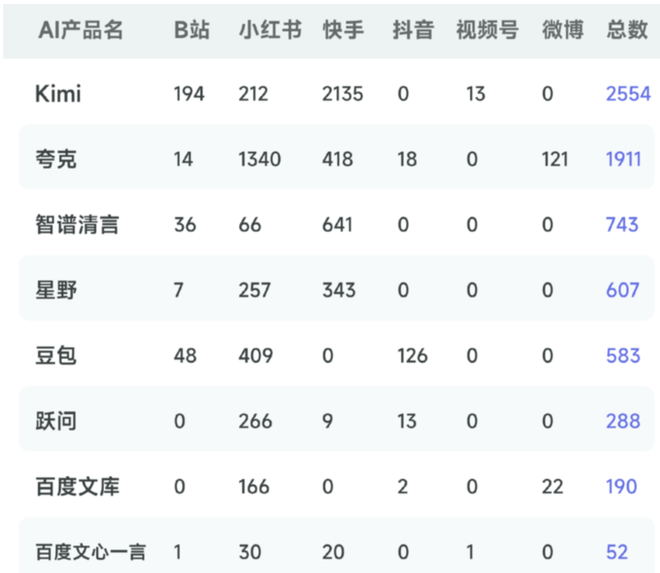 而激增的流量也是烧钱烧来的。2024年,各家大模型都在“烧钱投广告”以抢占消费者市场。根据AI新榜统计,Kimi在2024年8月到10月投放的广告数量是国产AI中最多的,其中快手的广告占总投放的80%以上。去年10月,Kimi的广告投放金额达到了2.2亿元。烧钱营销为Kimi带来了大量用户,到去年年底,Kimi的月活用户数量排在全国第三,曾一度被视为国内月活用户数最有希望破亿的AI之一。