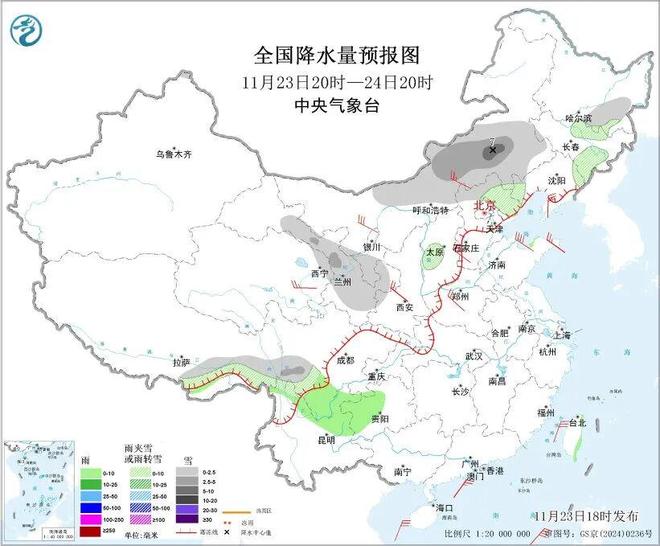 11月23日20时至24日20时,内蒙古中东部、黑龙江东南部、吉林东部、西藏东部、西北地区东部、华北北部、川西高原北部等地部分地区有小到中雪或雨夹雪,局地有大雪。四川南部、贵州中西部、云南中北部、台湾岛东部等地部分地区有小雨。