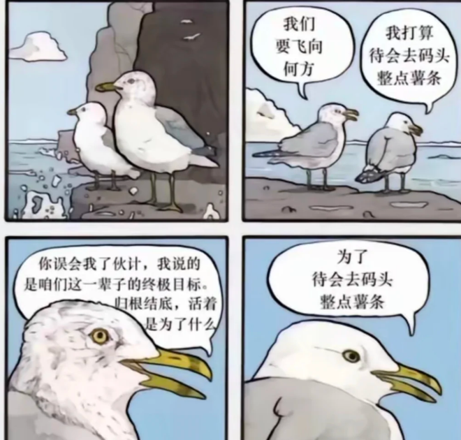 年轻人与哲学距离最近的时刻,大概是和海鸥一起反思人生意义,“为什么我的人生不能是去码头整点薯条呢?”