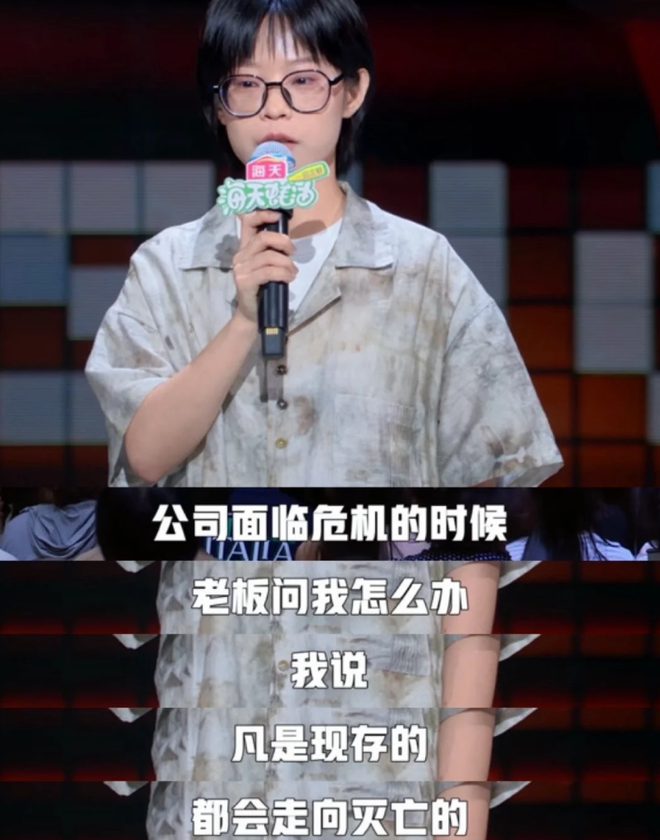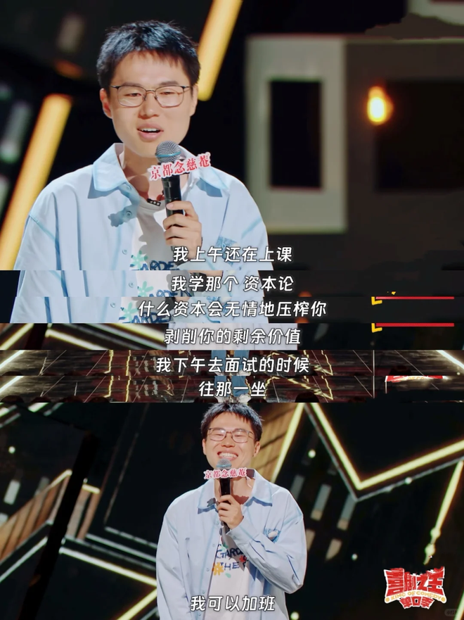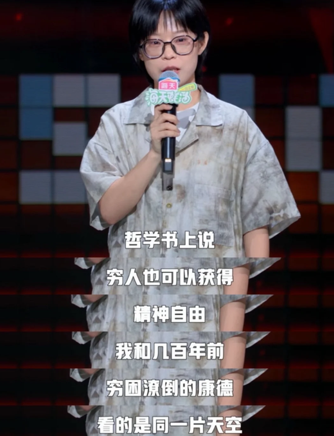 哲学系毕业的大国手在脱口秀综艺里讲哲学对自己恋爱造成的困扰,“因为我根本分不清男人是喜欢我还是喜欢哲学”;于祥宇一边在台上讲现代人的心理内耗工作,一边感叹“亚里士多德不如多劳多得”。