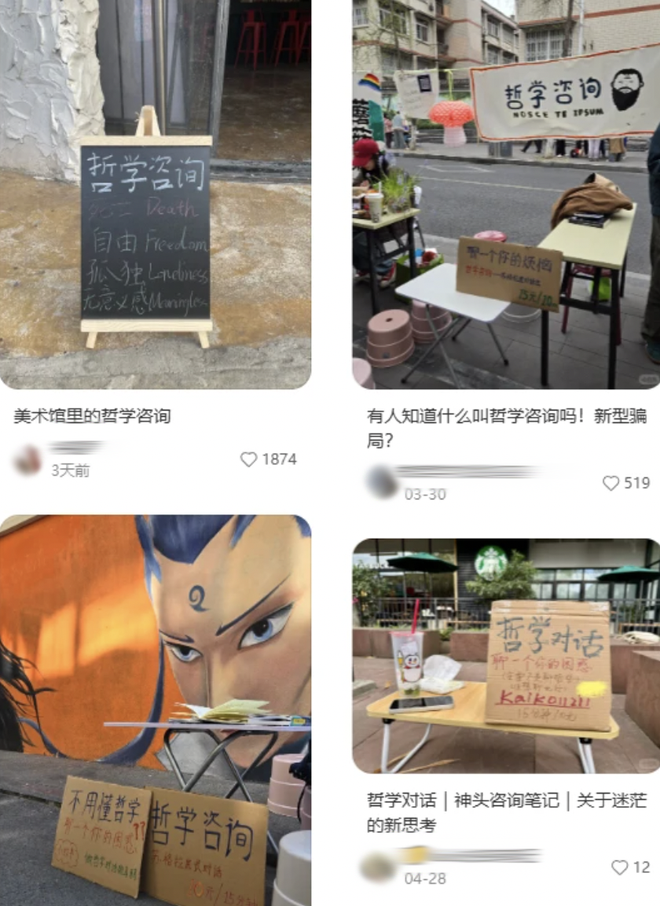 摊子上摆一块纸箱上拆下来的硬纸壳,体面点的会用小黑板。文案也都类似:哲学咨询;聊一个你的困惑;死亡/自由/孤独/无意义感(中英文);精通存在主义/现代性,以及最后一排:10元/15分钟。