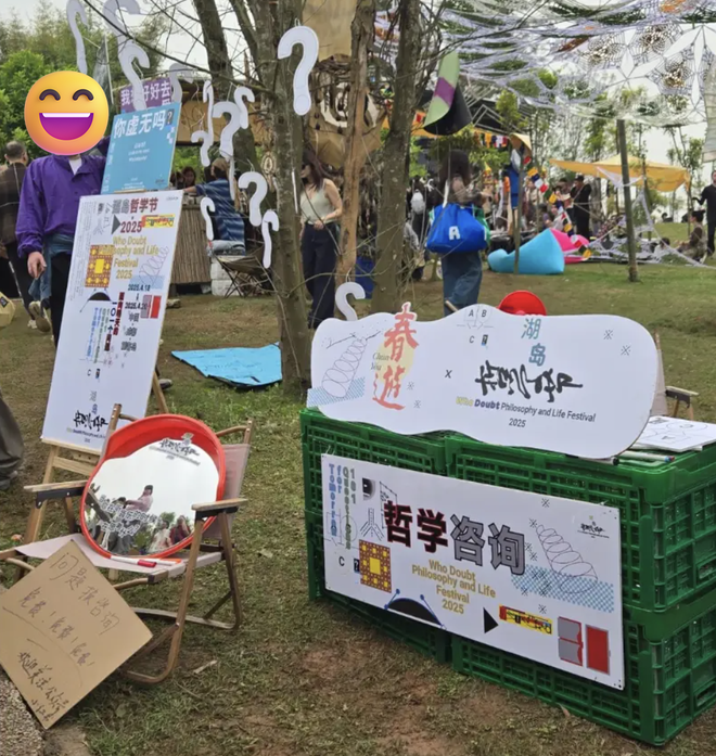 这次他拥有了一块打印的“哲学咨询”招牌,两把主办方提供的露营椅,条件比在街边好了不少。