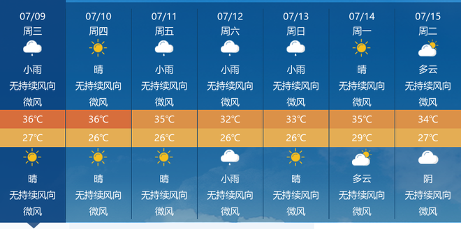 今天是2025年7月9日,武汉白天天气为小雨,夜晚天气为晴,白天微风,夜晚微风,最高气温36℃,最低气温27℃,空气湿度62%,体感温度38.1℃,空气质量优。建议市民外出携带雨具,注意防暑降温,避免高温时段长时间户外活动。