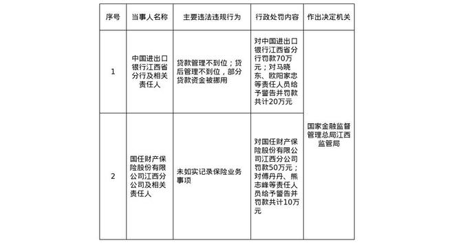 中国进出口银行江西省分行被罚70万,国任财险江西分公司被罚50万