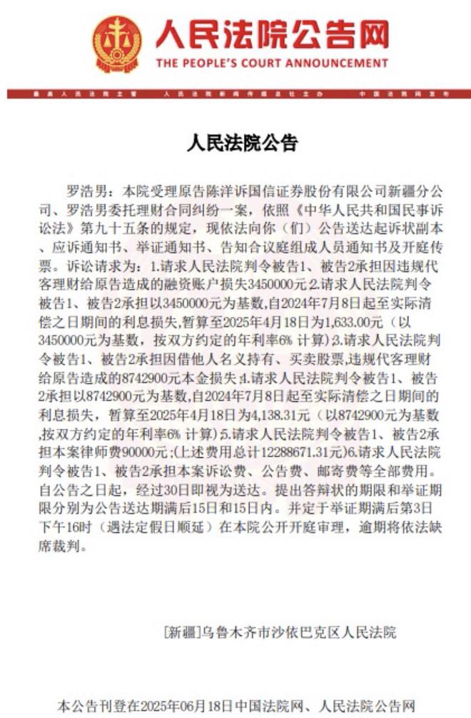 新疆一法院公告显示,投资者陈某将国信证券新疆分公司及罗浩男告上法庭,涉及委托理财合同纠纷一案,原告主张两名被告赔偿因违规代客理财造成的融资账户损失345万元及相应的利息;因借他人名义持有、买卖股票,违规代客理财给原告造成的874.29万元本金损失及利息,金额9万元的律师费及其他诉讼费用,合计达1228万余元。
