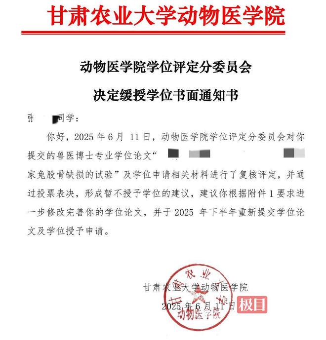 博士生论文答辩和再次评审均过80分,却被暂缓授予博士学位,甘肃农大动物医学院回应