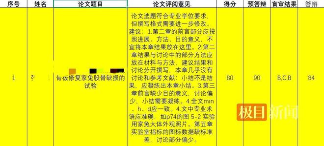 张先生告诉记者,根据学校、学院相关通知,针对2025届博士毕业生,今年6月初,该学院邀请多人组成兽医专业学位教指委专家组,对19名通过正式答辩的博士生论文进行再次评审打分,90分以上为优秀,60分以下为不合格。这19人的总得分在70分至92分不等,他最终得了80分。教指委专家出具评阅意见后,该学院开会对19人的学位申请材料进行审议,经集体审议、投票表决,给出12人通过、7人暂缓授予学位的建议,这7人的总得分在70分至84分不等。
