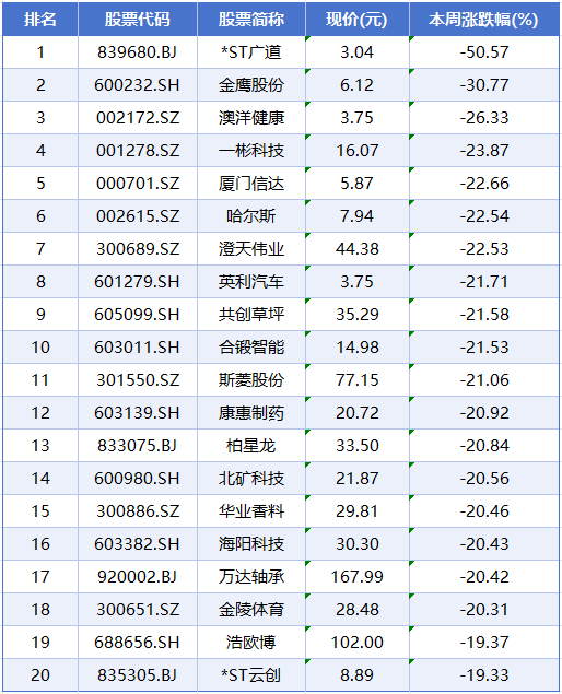 本周个股跌幅榜前五位分别是*ST广道、金鹰股份、澳洋健康、一彬科技、厦门信达,累计跌幅分别为50.57%、30.77%、26.33%、23.87%、22.66%。