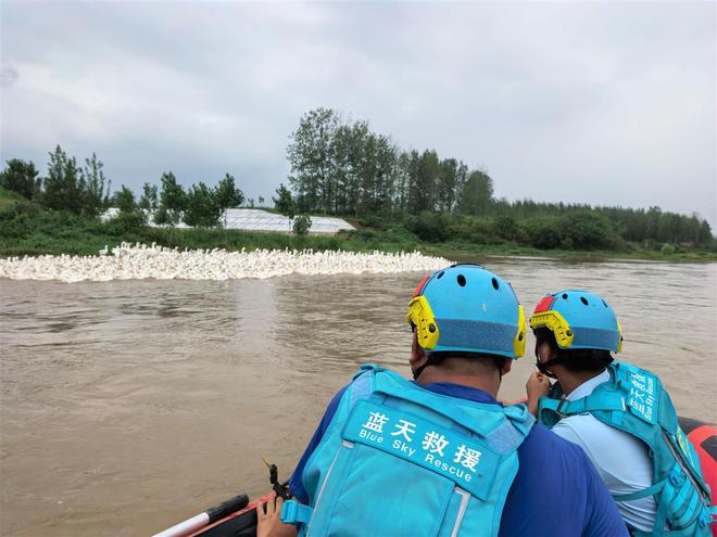 6月20日,河南信阳一家养殖场的鹅圈被大雨冲毁,上千只大鹅被卷入湍急洪流。当地蓝天救援队历时1个小时,将随时可能被冲走的鹅赶上了岸。
