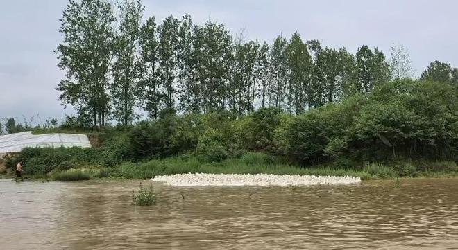 信阳一河道涨水冲毁鹅圈上千只鹅被卷入洪流,当地蓝天救援队一小时赶鹅上岸